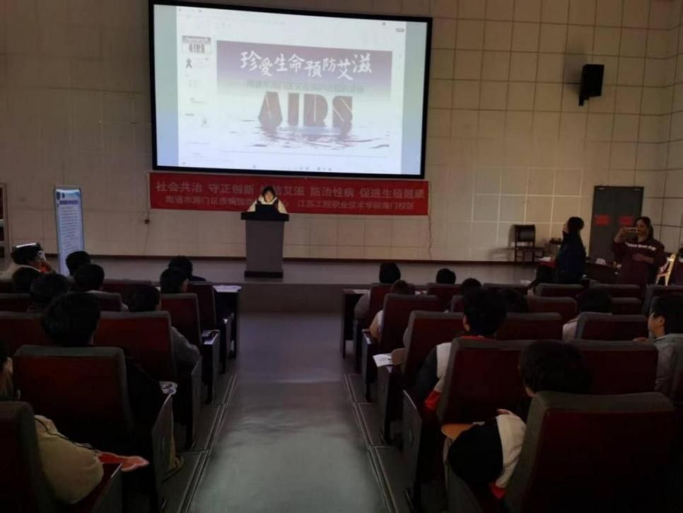 活动二:11月26日下午,45名骨干宣传志愿者在海门校区300人报告厅内先行座谈学习预防艾滋病、性病有关知识要点,随后与身边同学一起,参加到手举“防艾主题板”在校区内标志性地点的宣传活动打卡发圈活动中。