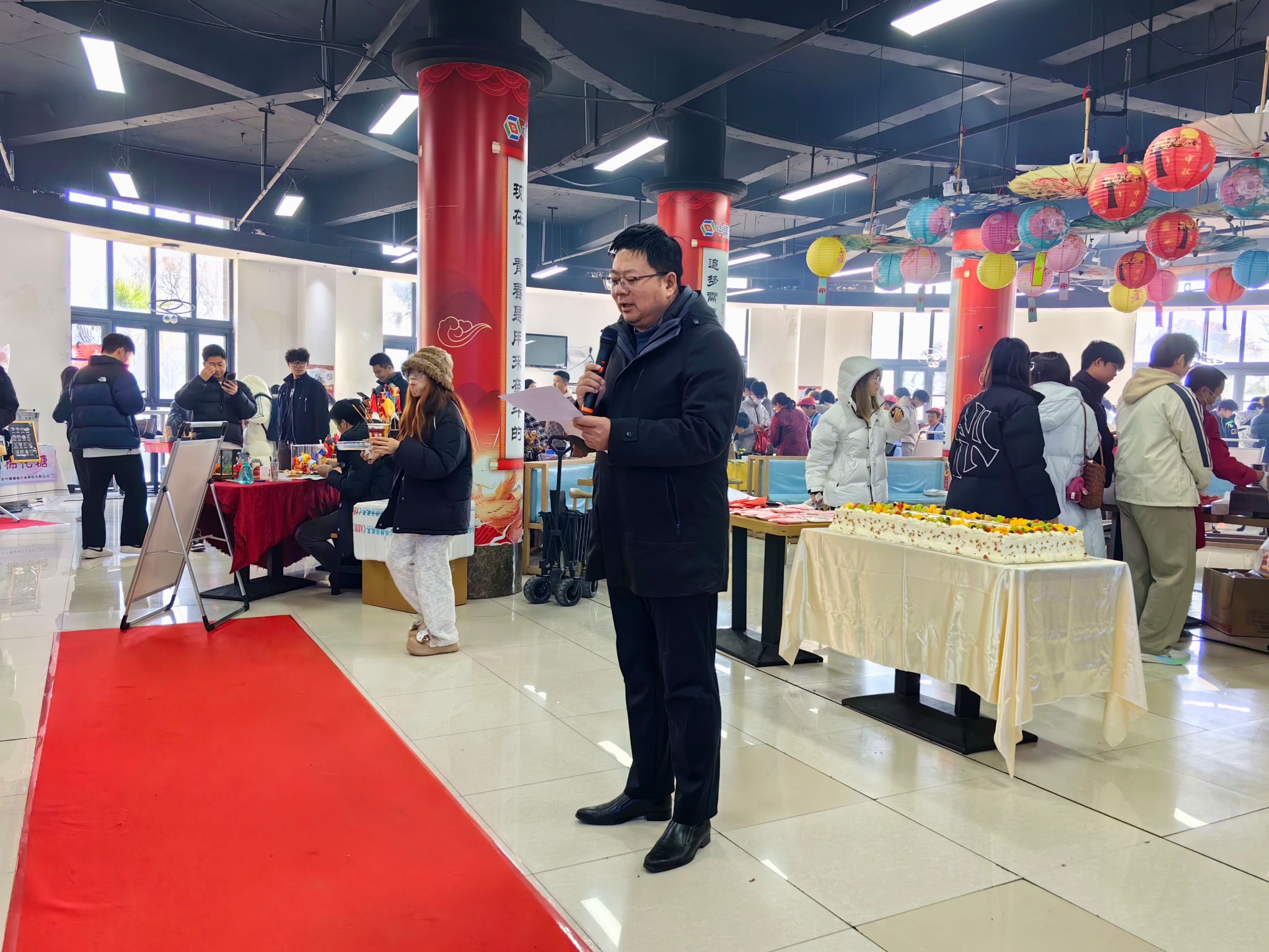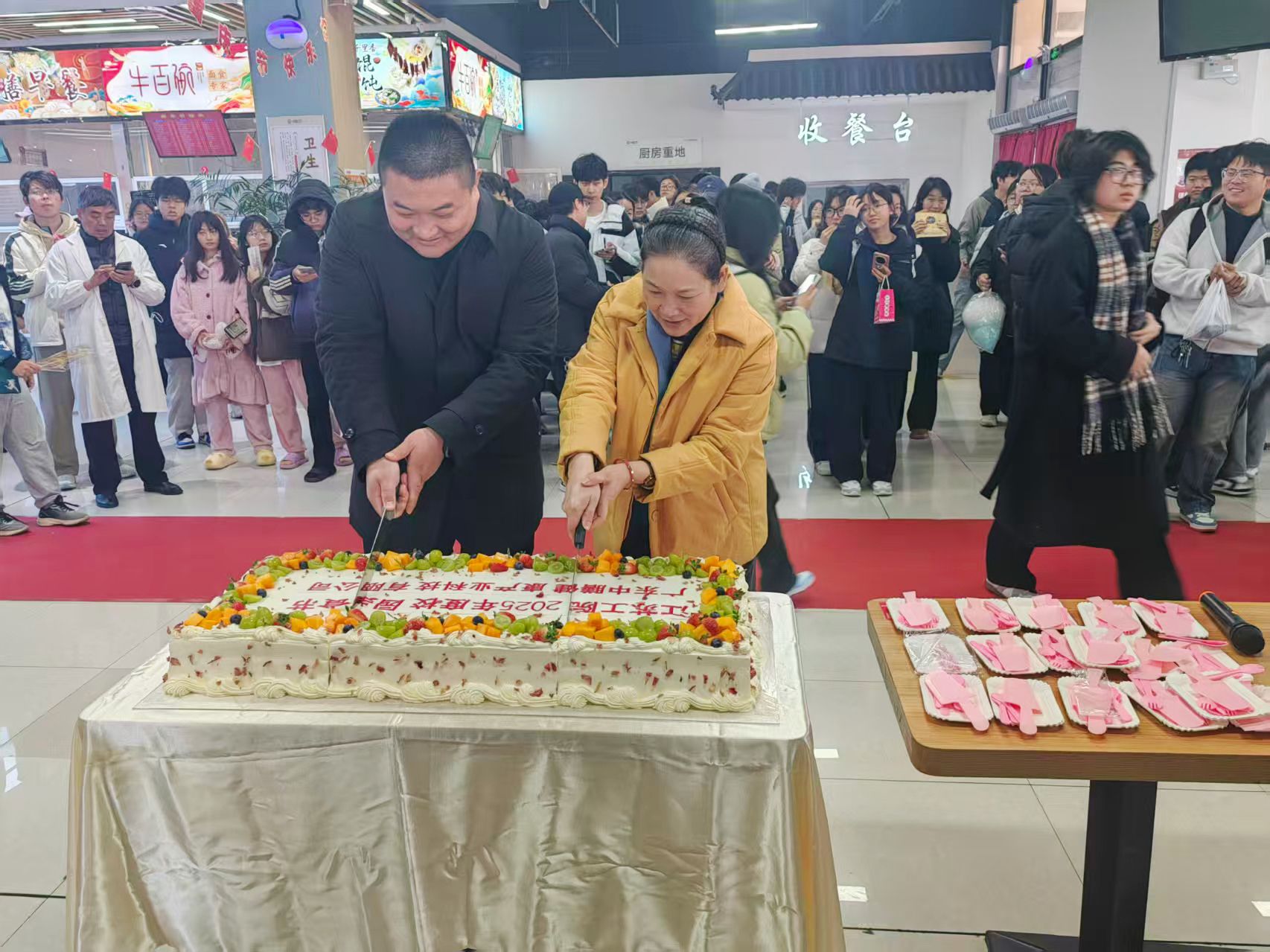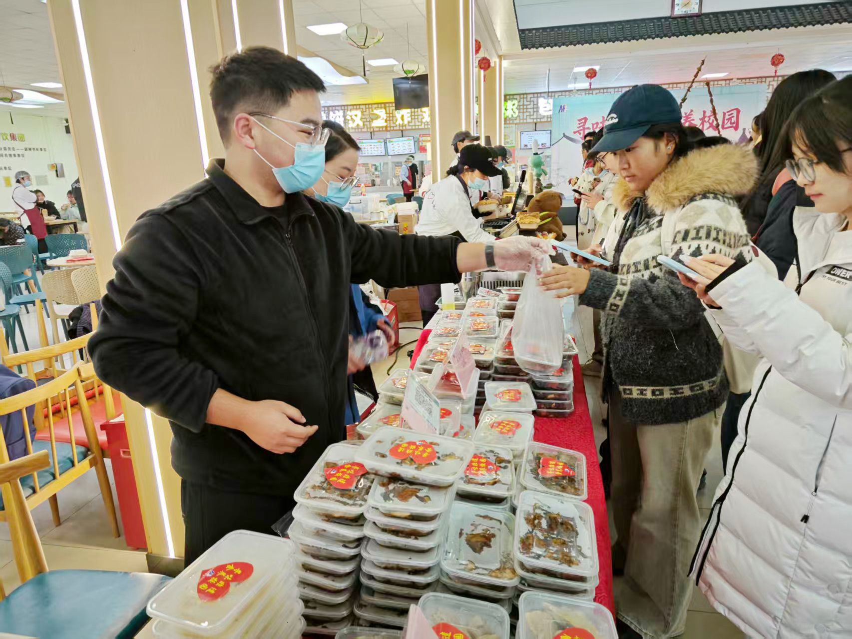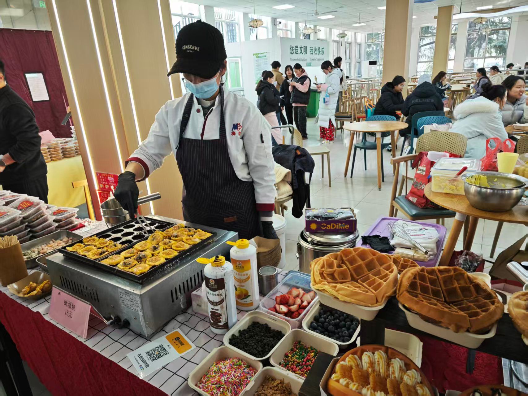 开幕后,两校区食堂变身沉浸式美食文化体验场。四家经营企业展台前人头攒动,香喷喷的非遗糕点、滋滋作响的特色烧烤、晶莹剔透的手工糖葫芦等美食琳琅满目,现场热闹非凡;糖人师傅以勺为笔、以糖为墨,瞬间勾勒出栩栩如生的各色形象;剪纸艺人指尖翻飞,红纸上跃出精妙图案;面塑摊位前,师傅手法娴熟,揉捏出憨态可掬的小动物,编织体验区的长龙队伍则传递着传统技艺的吸引力。巨型蛋糕成为共享喜悦的象征,梨汁、老姜糖水驱散冬日寒凉,校园满是美食与文化交融的烟火气与欢声笑语。
