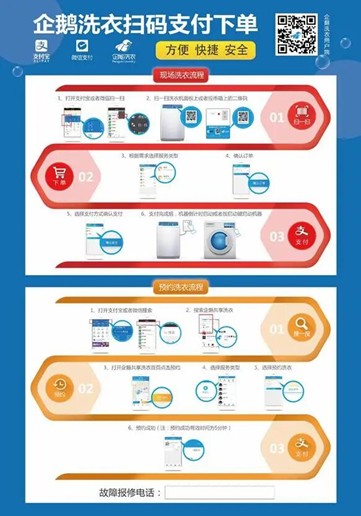 学生可通过胖乖APP进行操作,价格上墙公示。遇有故障可通过线上报修解决,也可拨打洗衣房内服务电话进行报修。
