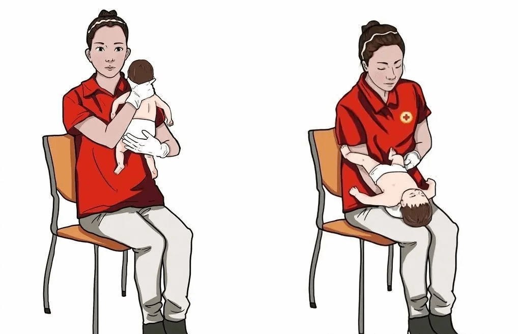 ①施救者坐位或蹲位,用两只手及前臂固定婴儿,将其翻转为仰卧位,保持婴儿沿着施救者手臂的方向,头低脚高顺放(或横放)在大腿上。