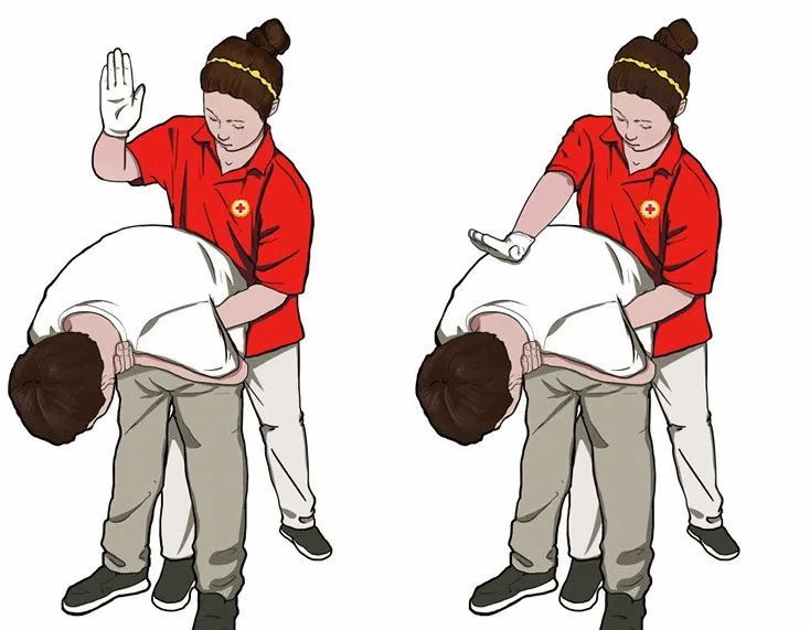 ①施救者站到患者身后,用一只手支撑患者胸部,让患者前倾(腰部向前弯曲),利于异物从口中排出,而不是顺呼吸道下滑。