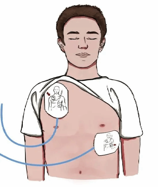 将两片电极片分别贴在婴儿和儿童的胸前正中及背后左肩胛处,体格较大的儿童也可如成人的位置贴放电极片。