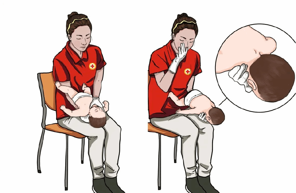 ③施救者用一只手的掌根部在婴儿两肩胛骨之间叩击5次。