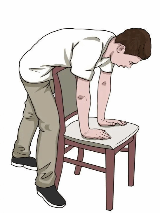 ③还可选择将上腹部抵压在一块坚硬的平面上,如椅背、桌缘、走廊栏杆等处,弯腰并连续向内、向上冲击,直至排出异物。